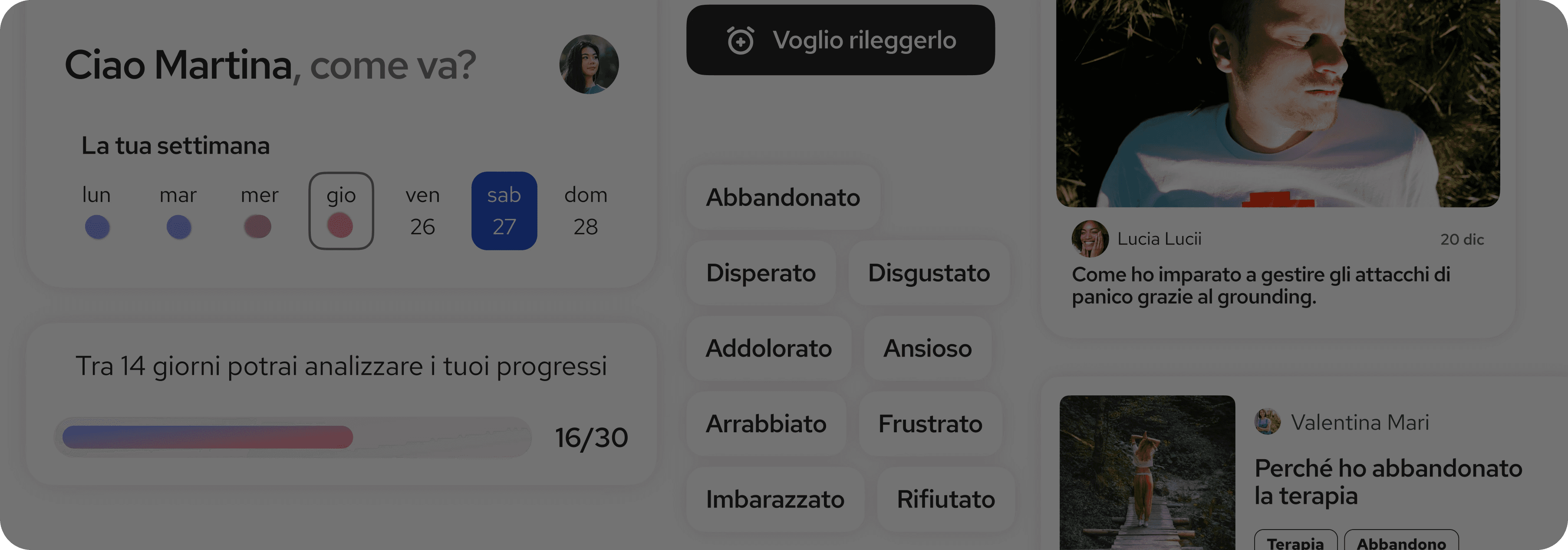Un'app che supporta pazienti in terapia tra una seduta e l'altra attraverso diario guidato, community anonima, analisi AI dei progressi e comunicazione diretta col terapeuta.